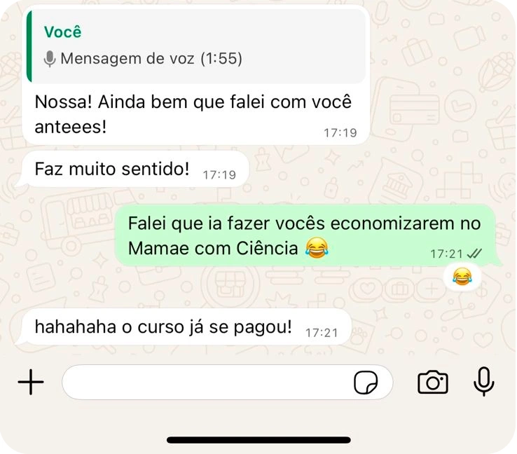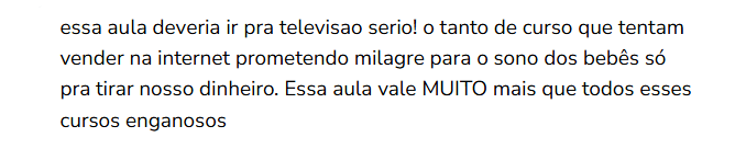 A Thalita, mora no Canadá só com o marido e morria de medo de não saber cuidar da filha, principalmente em relação à saúde. Procurava respostas na internet, mas só encontrava informações soltas e confusas. No programa, encontrou conhecimento baseado em ciência e acolhimento materno. Descobriu no plantão de dúvidas semanais o suporte que precisava. Hoje, se sente muito mais segura, tranquila e com paz de espírito para cuidar da filha. Para ela, o curso não foi gasto, foi investimento e já ultrapassou todo o retorno esperado, trazendo a certeza de que ela vai dar conta de tudo.