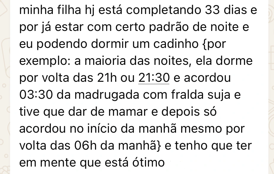 Antes do Mamãe com Ciência, a Regina vivia insegura: “Durante a gravidez eu via outras mães com colostro, e pensava: meu Deus, eu não vou ter leite, não vou conseguir amamentar.” Além disso, nunca tinha trocado uma fralda e não sabia como lidar com os primeiros cuidados do bebê. No programa, aprendeu sobre pega, hora dourada, preparo para a amamentação e primeiros cuidados. Hoje, se sente confiante: sabe identificar o que o bebê precisa, lida melhor com as noites difíceis e afirma que a preparação fez toda a diferença para viver a maternidade com mais segurança.